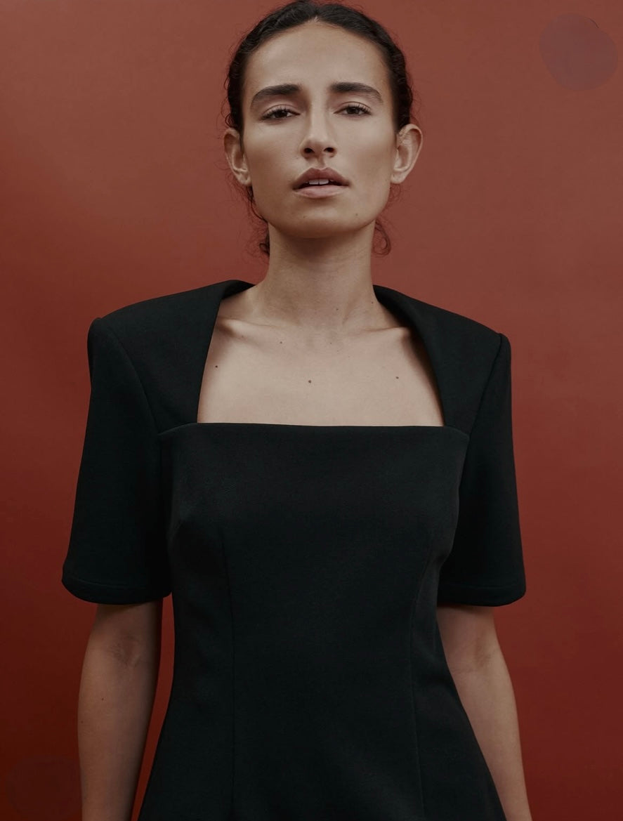 The Elise Top features padded shoulders and a square neckline for a sharp, structured silhouette. Sculpted through the waist for a flattering fit, it is crafted from comfortable stretch bonded crepe and finished with a back zipper closure.