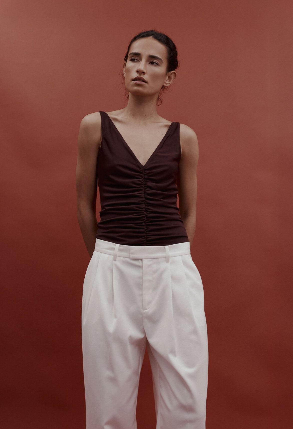 Model is 181 cm and wears a size S (NZ/AU/UK 8). This style is designed to fit close to the body. We recommend taking your usual size, or sizing down if you run between sizes, unless you require extra bust room.Â
