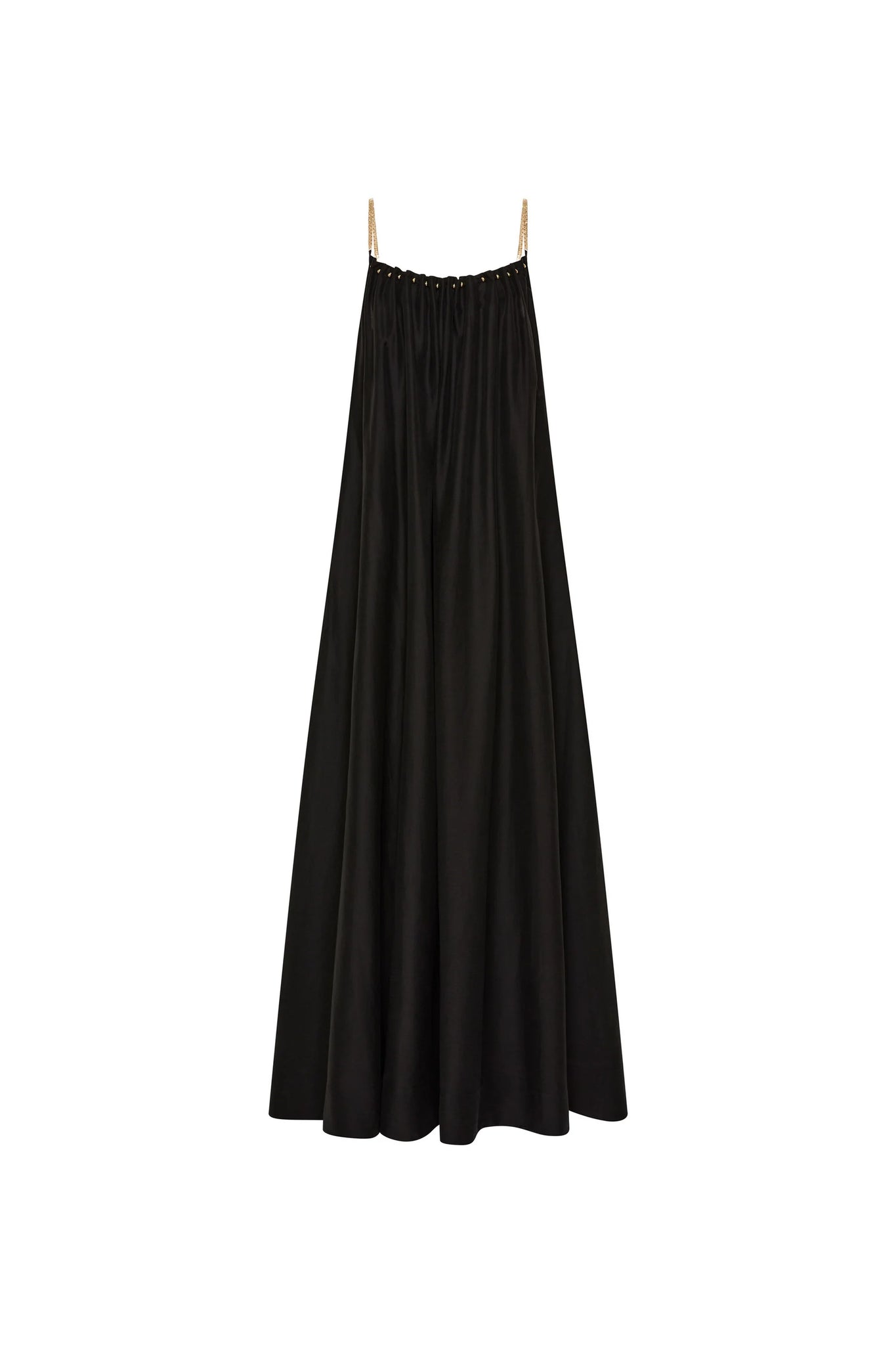The Sable Maxi Dress in black redefines modern elegance, adorned with gold beaded details. Designed with a trapeze silhouette, its scoop neckline is supported by adjustable gold chain straps, offering structure and ease of wear. The low scoop back accentuates the flattering relaxed fit, exuding allure and chic style. Perfect for transitioning from day to evening, this versatile dress is a wardrobe staple.