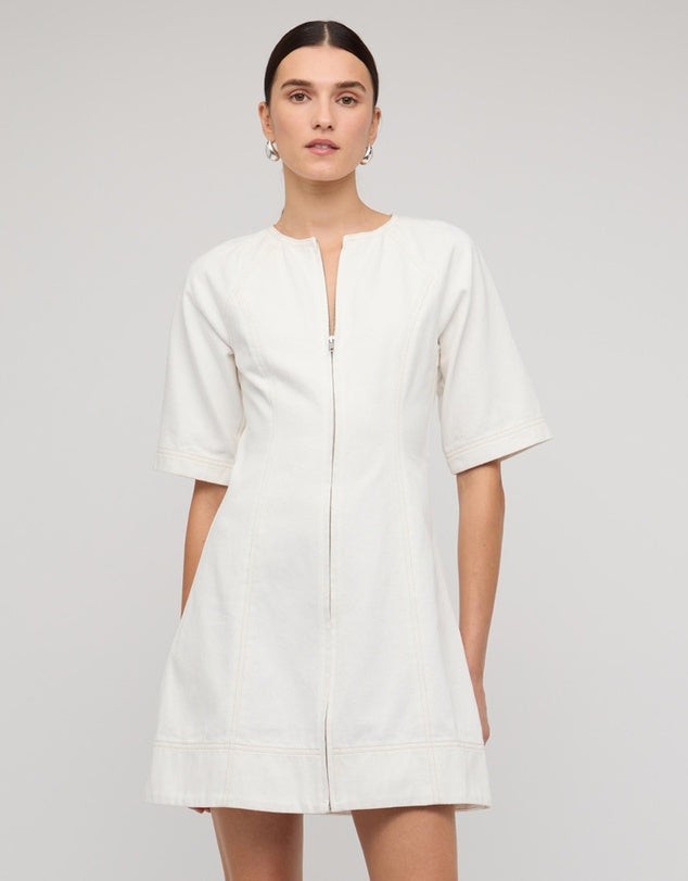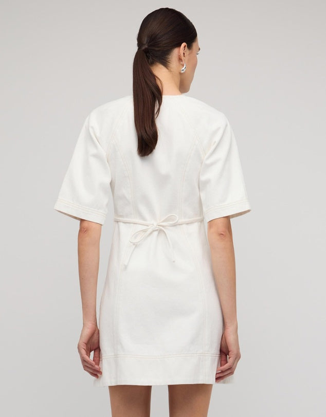 The Zenith Denim Mini Dress blends structure with ease for an effortlessly modern look. Crafted from 100% cotton denim, it features a centre-front zip closure, short sleeves, and a tie-back detail to create shape. The clean white finish makes it a versatile piece you can dress up or down.