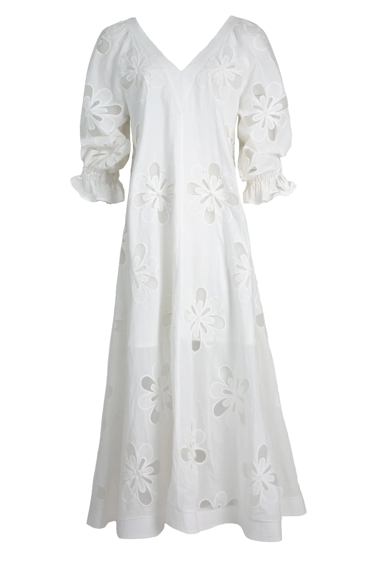 Whimsical organza backed cutwork grants the 'The Place to Vee' dress effortless charm. Crafted in the 'As Fresh as a Daisy' cotton, this dress sports a flattering swing silhouette complete with a V-neckline and back. Elasticated cuffs offer push-and-puff styling while a generously cut skirt adds whimsical movement. Sheer organza backed floral cut-outs and a multi stitched hem are the finishing touches to this quintessentially Trelise dress.