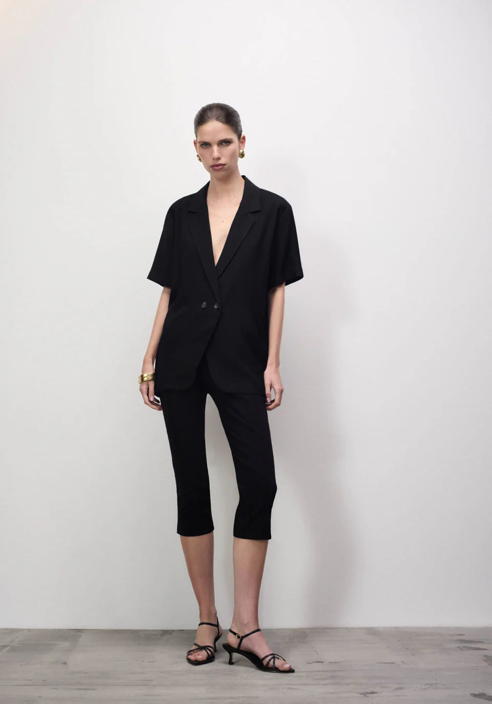 Introducing the Hepburn Shirt, a refined take on our iconic Chorus Shirt, tailored in a luxurious black bamboo blend. With its double-breasted front and relaxed fit, this piece offers timeless versatility. Effortlessly pair it with the Ivanhoe Pant for a chic set, or style with tailored separates or denim for a classic, polished look.